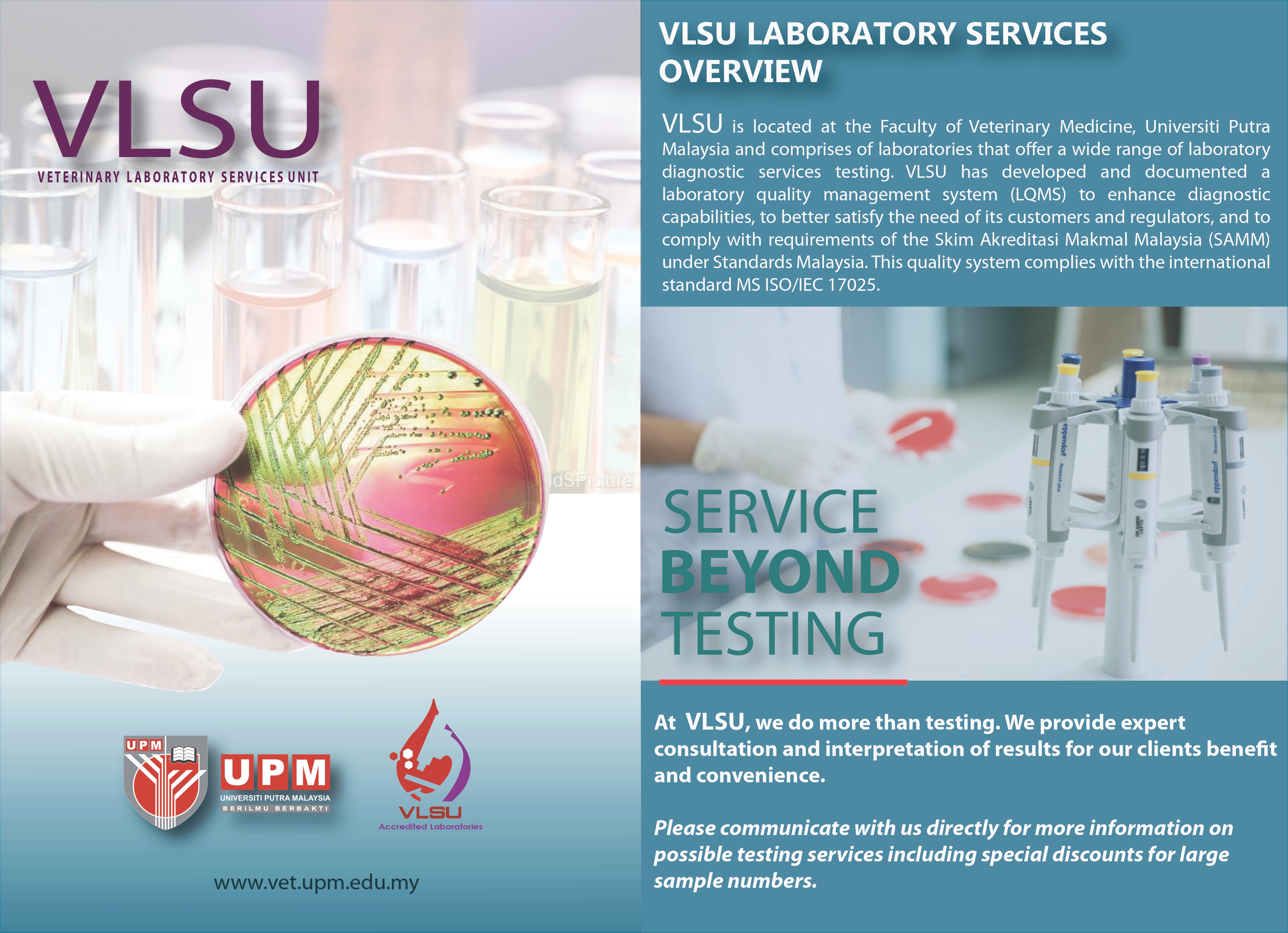 At VLSU we do more than testing, we provide expert consultant and interpretation of result for our clients benefit and convinience. Please communicate with us directly for more information on possible testing service including special discounts for large sample numbers.